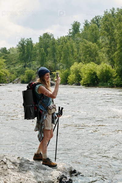 Женщина, путешествующая на открытом воздухе и фотографирующаяся со смартфоном