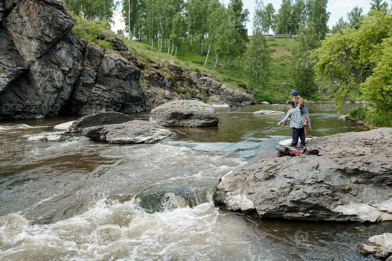 Мальчик-подросток ловит рыбу с посохом, стоящим на открытом воздухе на берегу Рокки Ривербанка
