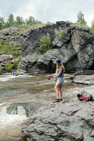 Женщина ловит рыбу у реки в скалистом наружном ландшафте