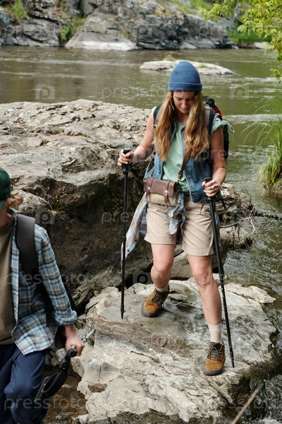 Женщина, идущая в поход с треккинговыми полями возле речной природы