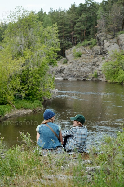 Мать и сын сидят на берегу реки, разговаривают