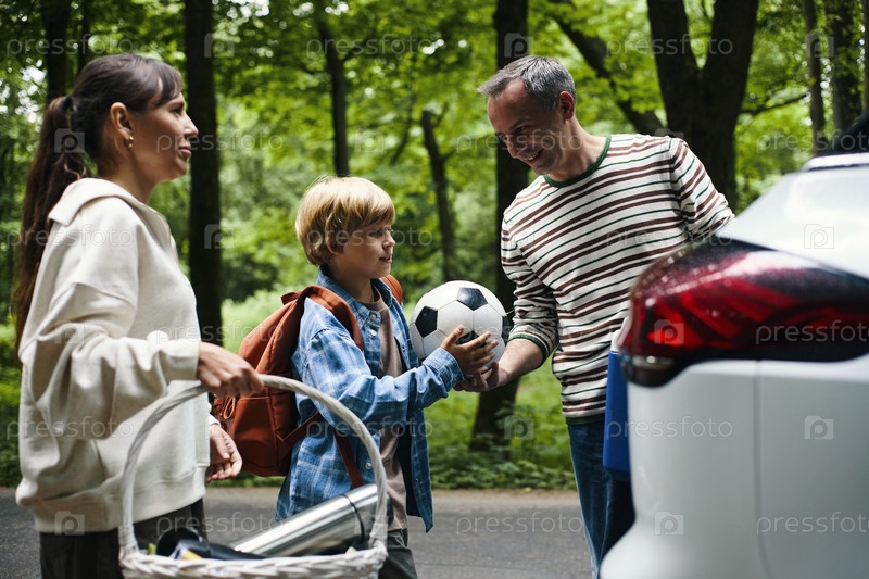 Семейный автомобиль для дорожной поездки с улыбающимся ребенком, держащим футбольный мяч