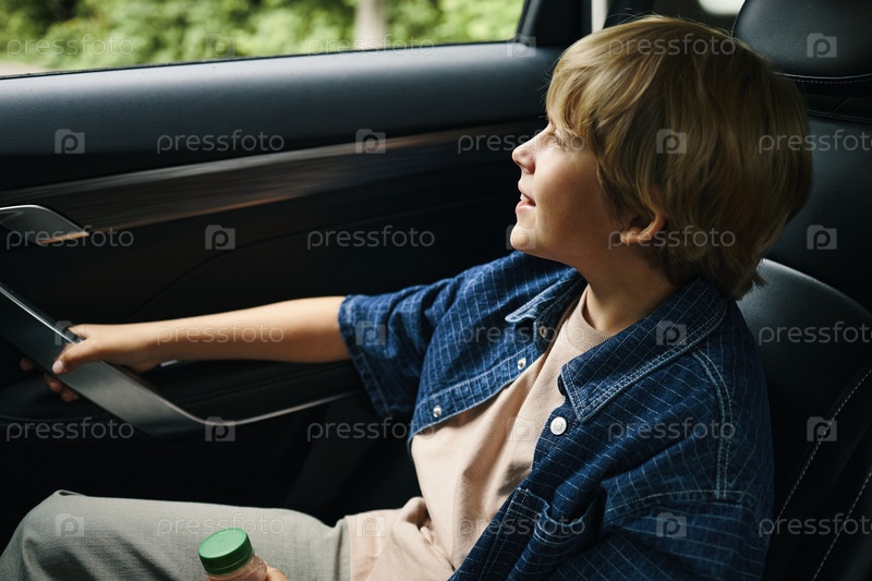 Мальчик, сидящий на заднем сиденье машины и улыбающийся во время семейной поездки