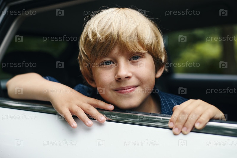 Портрет улыбающегося мальчика, прислонившегося к окну автомобиля во время дорожной поездки