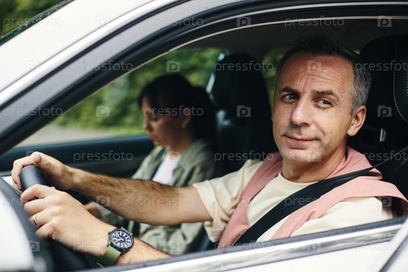 Мужчина средних лет управляет автомобилем с женщиной-пассажиром среднего возраста