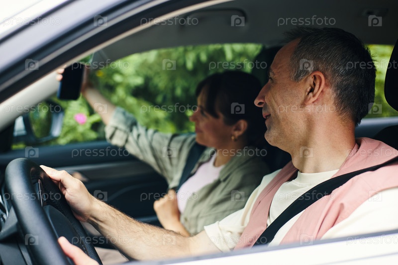 Мужчина средних лет управляет автомобилем с молодой женщиной, которая делает селфи