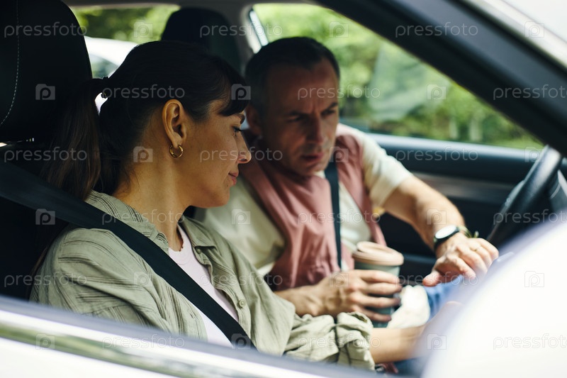 Мужчина среднего возраста и женщина, управляющие автомобилем во время семейной поездки