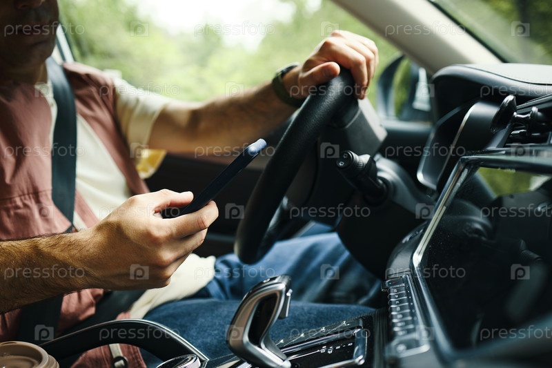 Мужчина среднего возраста использует смартфон во время рулевого управления автомобилем в дорожном путешествии