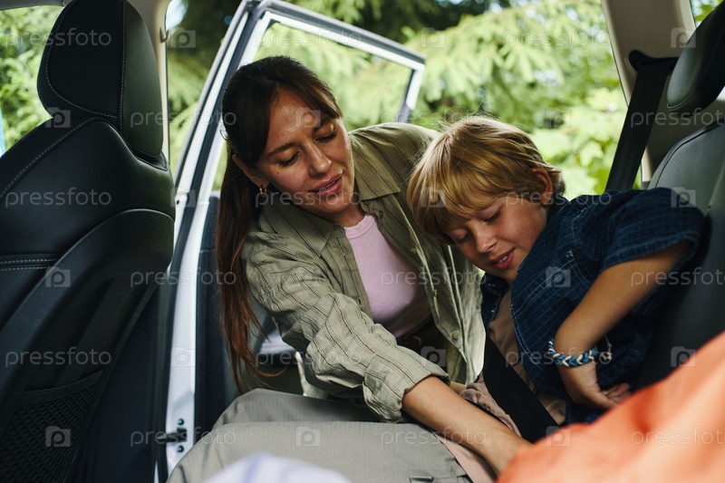 Молодая женщина помогает ребенку закрепить ремень безопасности во время дорожной поездки