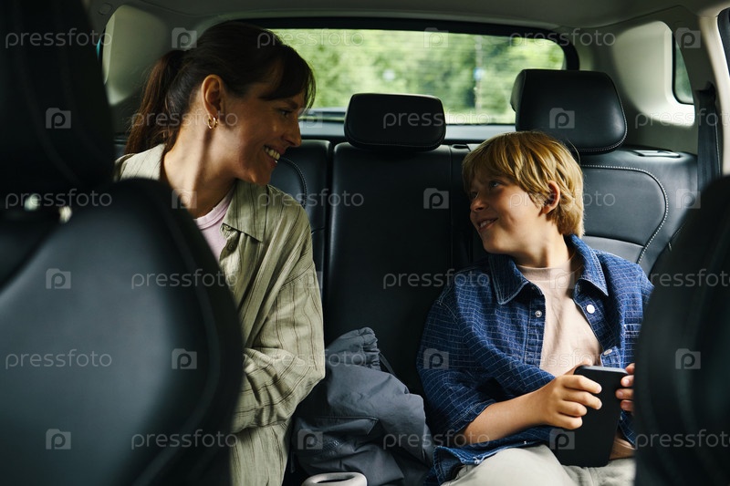 Женщина и молодой мальчик улыбаются и разговаривают во время семейной поездки