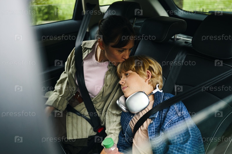 Женщина среднего возраста утешает ребенка во время дорожной поездки