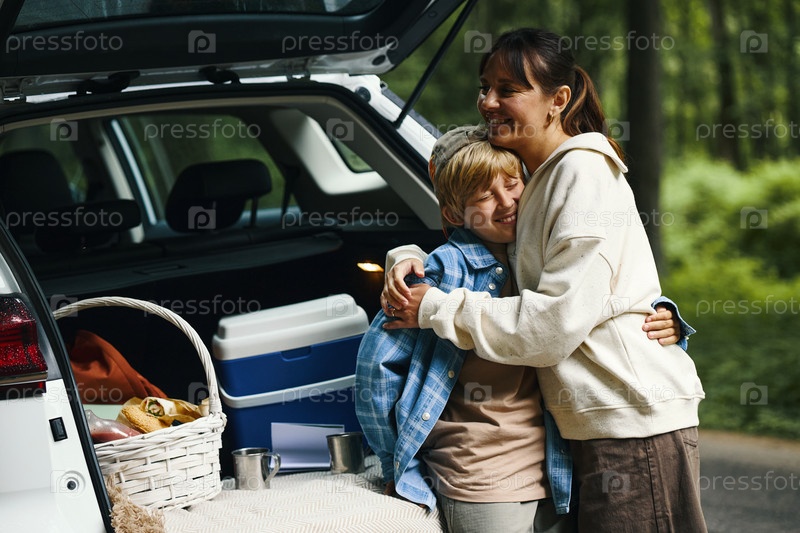 Женщина среднего возраста обнимает ребенка во время семейной поездки