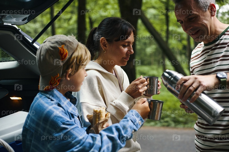 Семья наслаждается горячими напитками вместе во время дорожной поездки на открытом воздухе