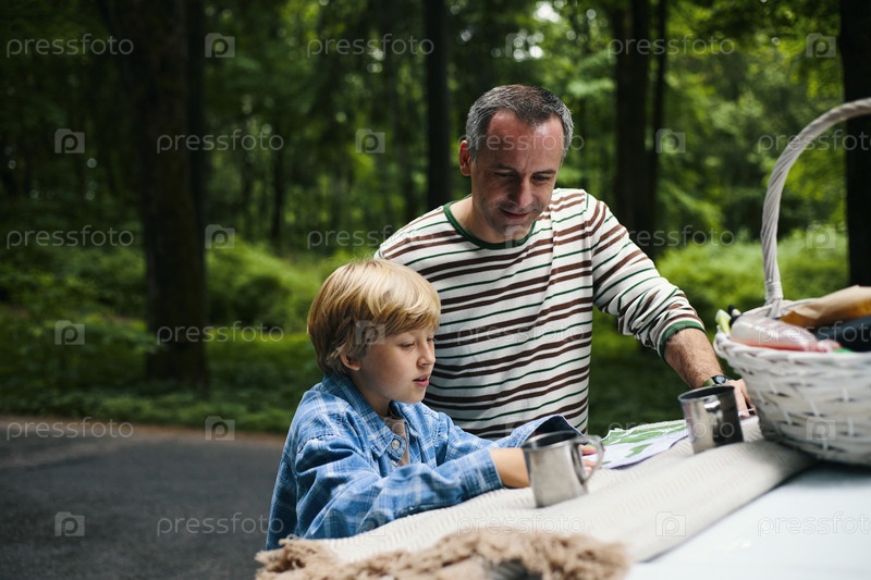 Мужчина среднего возраста и ребенок планируют маршрут во время семейного путешествия