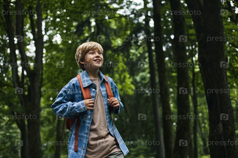 Ребенок-мальчик, исследующий лес во время семейного дорожного путешествия Adventure