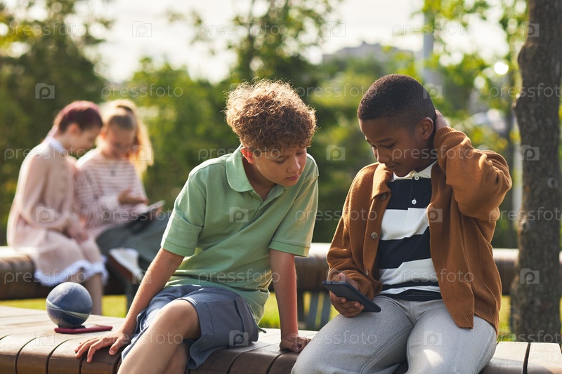 Два мальчика сидят на улице, используя смартфон, в то время как друзья общаются