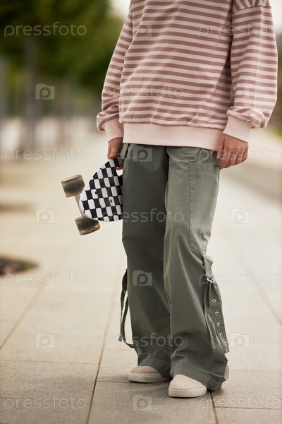 Девушка-подросток держит скейтборд, стоя на улице