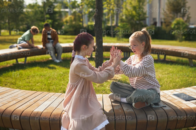 Девчонки играют в рукоплескательную игру на открытом воздухе в парке, расположенной между двумя местами