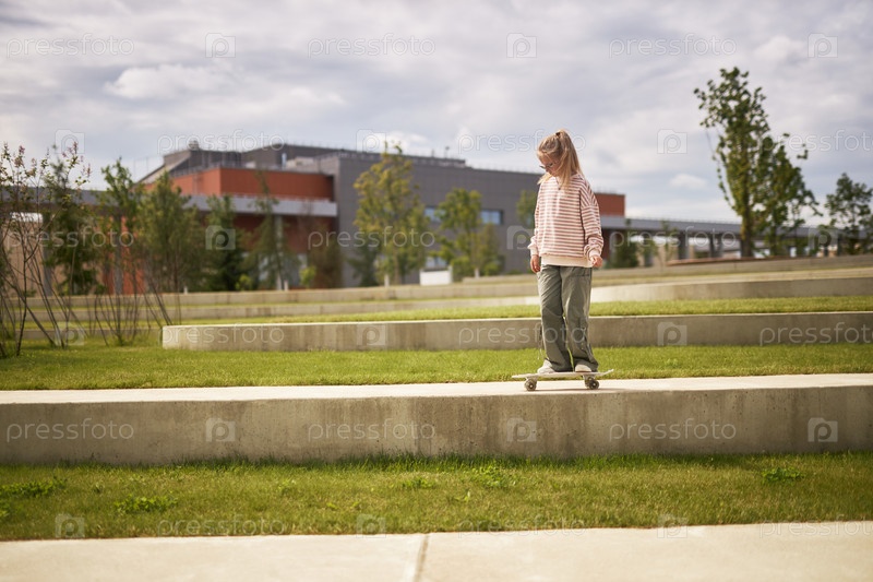Подростковая девушка балансирует на скейтборде На открытом воздухе в городском парке