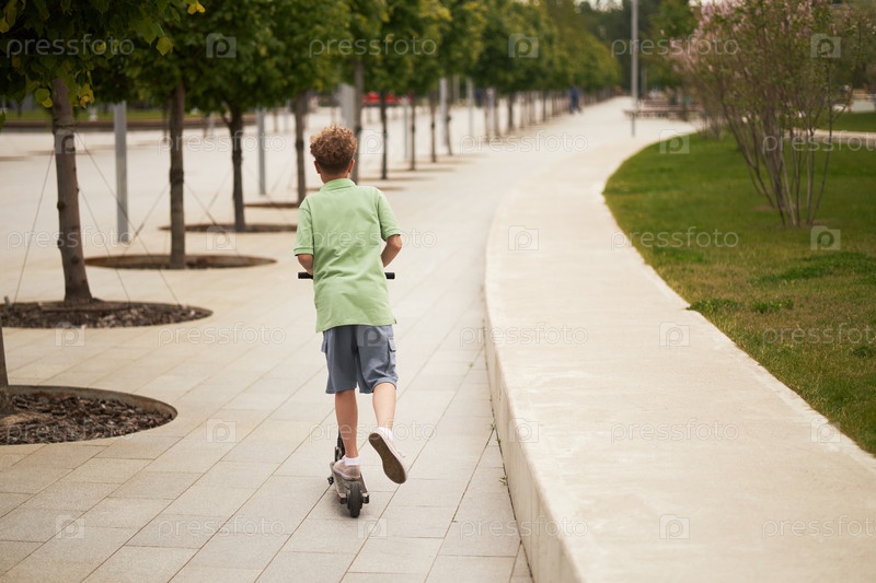 Мальчик, едущий на скутере вдоль городского паркового пути в летний день
