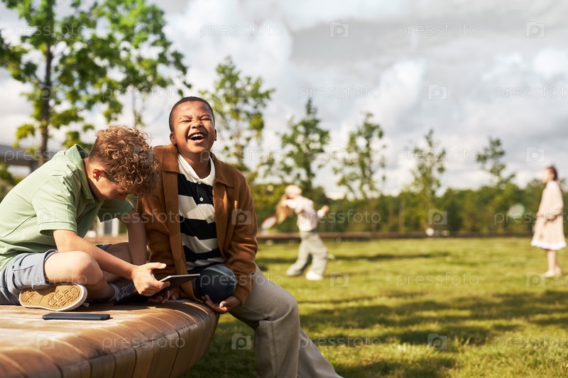 Чернокожий подросток смеется с другом, используя цифровые планшеты на открытом воздухе