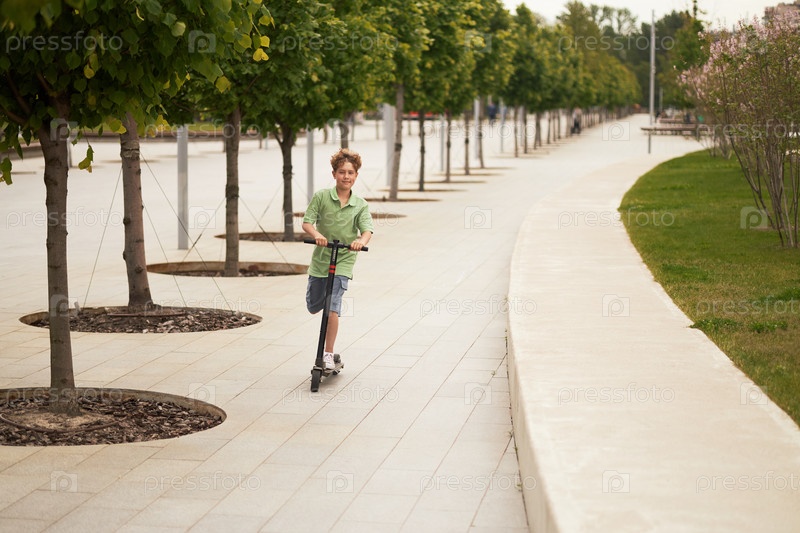 Ребенок едет на мотороллере вдоль тропинки с деревьями в городском парке