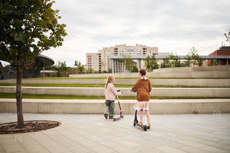Две девушки едут на скутерах на открытом воздухе в городском парке