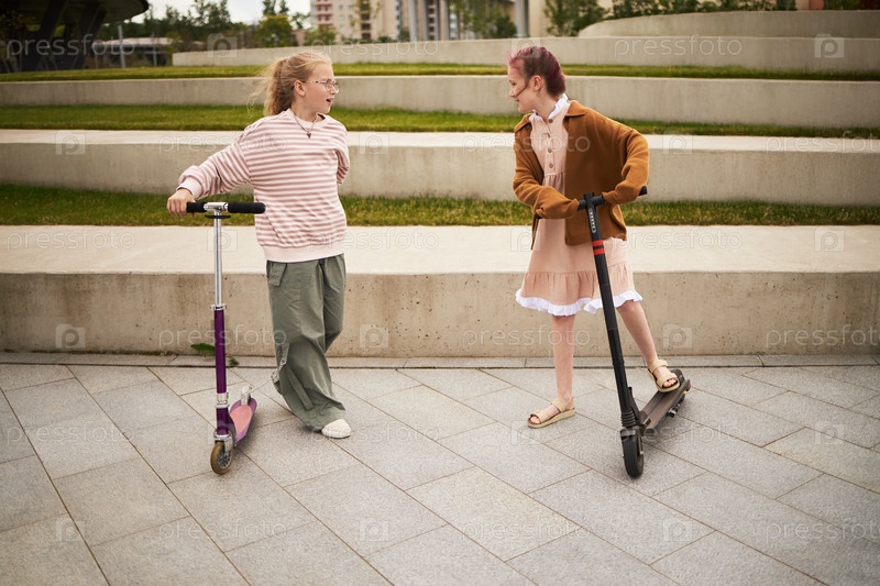 Две девочки-подростки разговаривают на открытом воздухе, стоя с скутерами в городском парке
