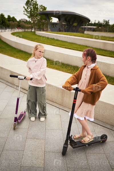 Две девочки-подростки едут на скутерах на открытом воздухе в городском парке