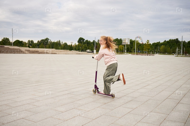 Девушка едет на скутере на улице на городской площади летом