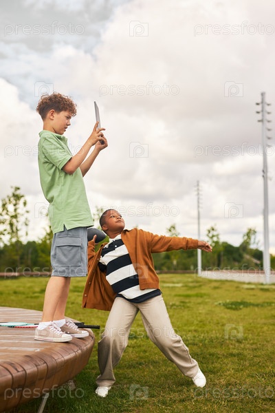 Подросток фотографирует, пока чернокожий парень бросает мяч в парк