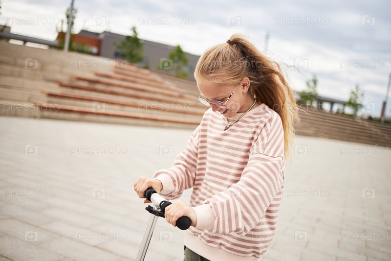 Подростковая девушка улыбается во время езды на скутере в открытом воздухе в городской зоне