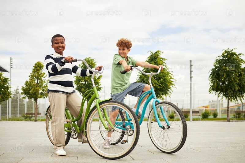 Черный мальчик и юноша-претендент ездят на велосипедах вместе на открытом воздухе