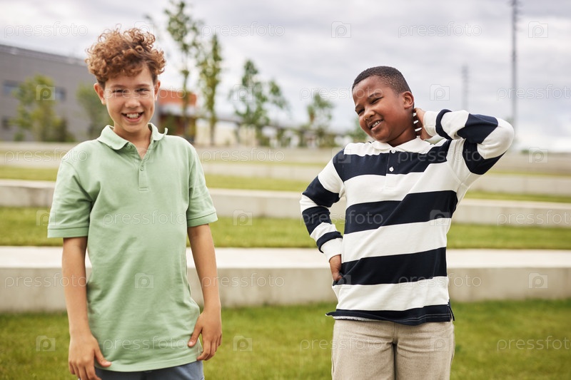 Два мальчика улыбаются и отдыхают на открытом воздухе в городском парке