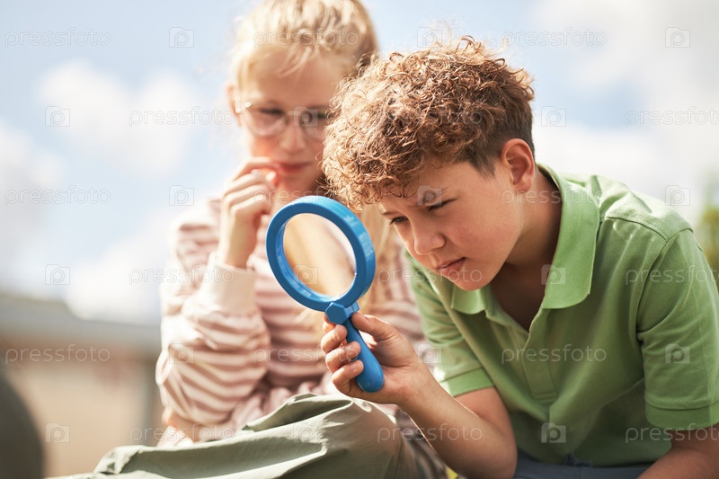 Мальчик осматривает объект с помощью лупы, в то время как девушка сидит поблизости