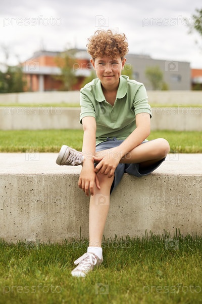Портрет мальчика-подростка, сидящего на улице и улыбающегося камере