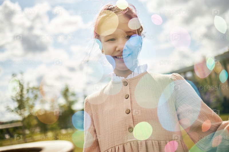 Портрет улыбающейся девушки на открытом воздухе, окруженной красочными световыми эффектами