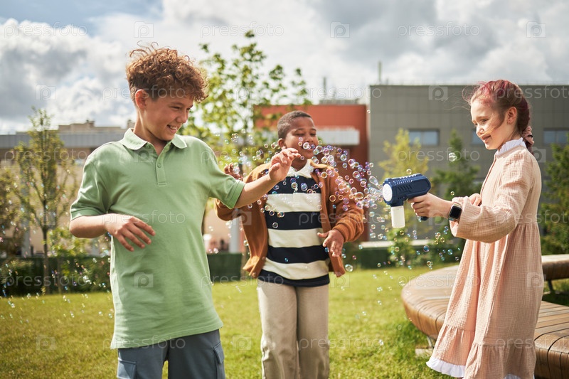 Мальчик и чернокожий мальчик смеются, в то время как девочка создает пузыри на открытом воздухе