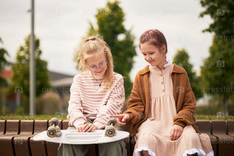 Две девочки, сидящие на улице и взаимодействующие со скейтбором вместе