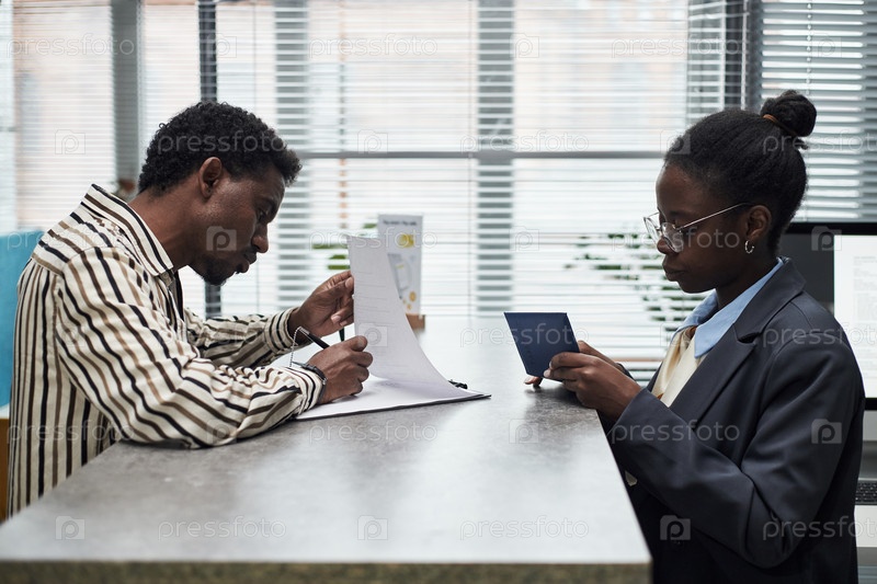 Чернокожий мужчина средних лет подписывает документы с помощью молодой черной секретарши