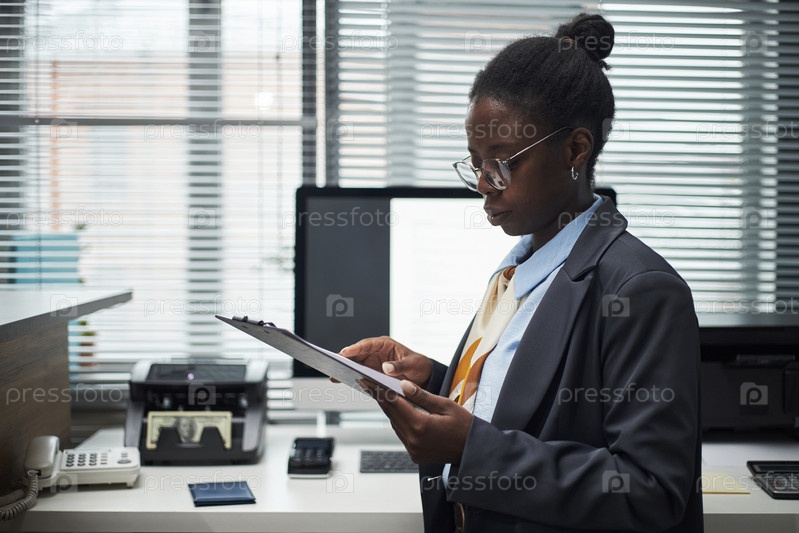 Молодая взрослая чернокожая женщина просматривает документы на иллюстрационной доске в банковском офисе