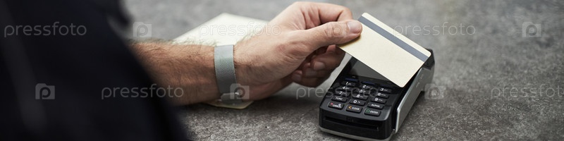Человек делает бесконтактные платежи с помощью терминала кредитной карты