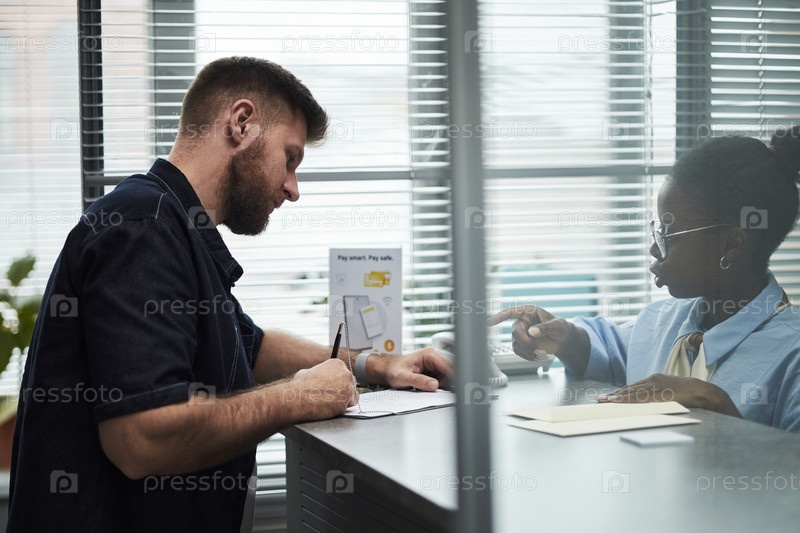 Молодой человек заполняет банковские формы, а чернокожая женщина оказывает помощь
