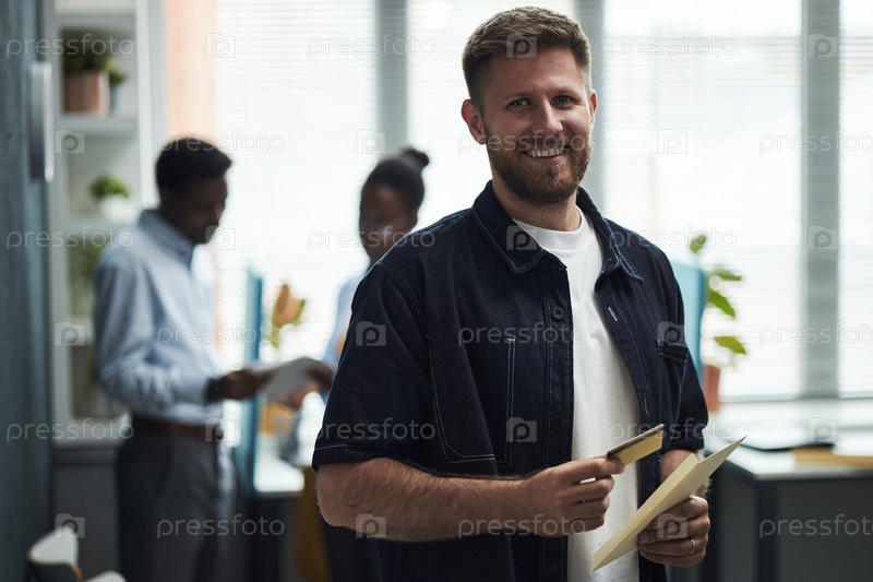 Молодой человек держит кредитную карту улыбаясь в банковском офисе
