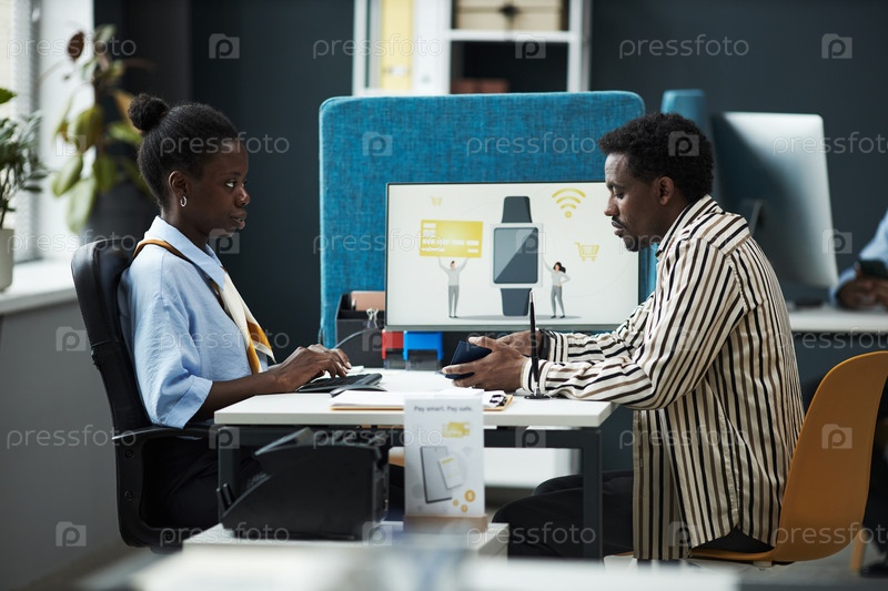 Молодая чернокожая женщина помогает мужскому клиенту в банковской конторе