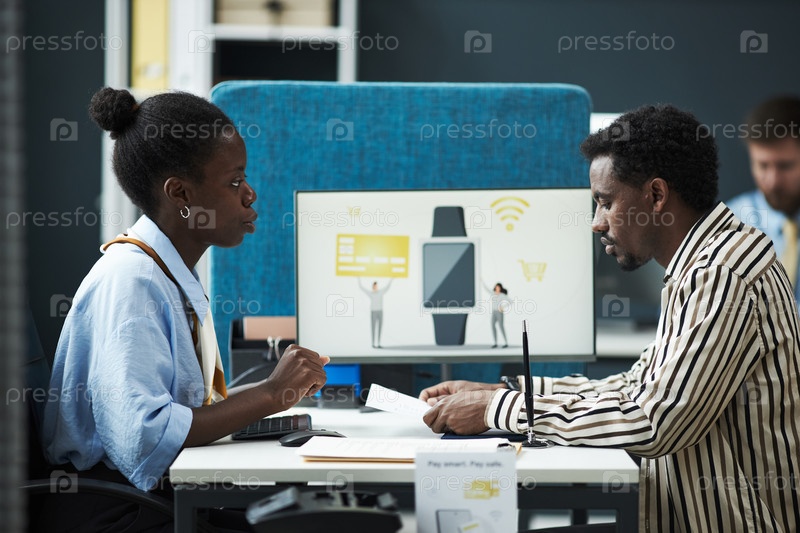 Молодая чернокожая женщина обсуждает умные платежи с клиентом-мужчиной в офисе банка