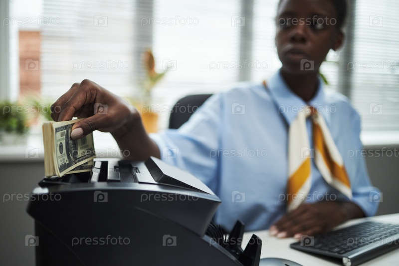 Черная женщина банковский кассир подсчитывает наличные с денежным счетчиком в офисе