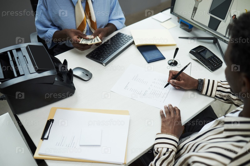 Клиент подписывает документ, в то время как банковский сотрудник считает деньги