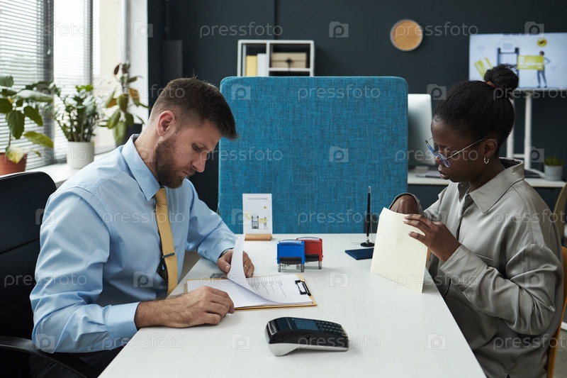 Банковский служащий подписывает документы с чернокожей молодой женщиной