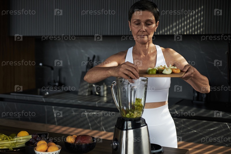 Женщина средних лет готовит здоровый смузи на современной кухне